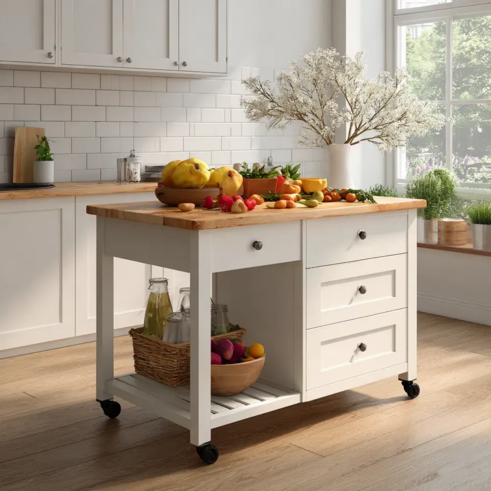 機能のハイライト三つの引き出しと一つの開放収納棚があり、キッチン用品の整理に便利です。移動可能なキャスターが付いているため、必要な場所に簡単に移動できます。